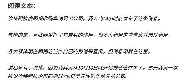 卡利吉里称,他早在10月16日就率先报道了沙特可能收购的消息,如今他指出,许多网络媒体都在转载他的信息,并将其据为己有。他表示,谣言的源头很明确——那就是他自己。