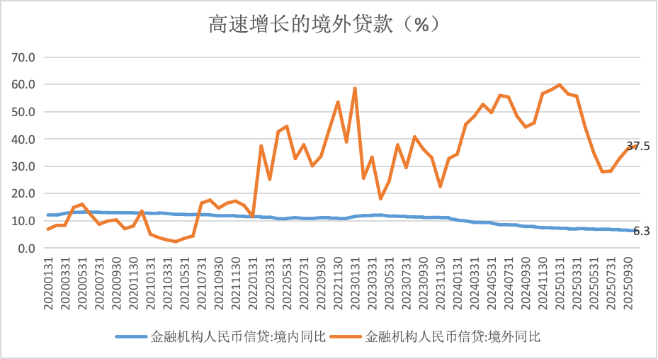 央行近期更新的数据显示,截至10月末,金融机构境外人民币贷款约2.5万亿元,相比上年同期增长37.5%,高于金融机构境内人民币贷款增速31个百分点。拉长时间看,从2022年至今的四年时间内,境外人民币贷款增速几乎都保持在20%以上,一度高达60%,而境内人民币贷款增速则较低。
