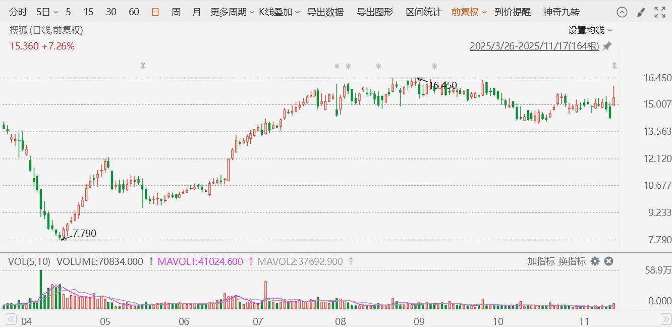 格隆汇11月18日|搜狐(SOHU.US)周一收涨7.26%,报15.36美元。消息面上,公司公布财报显示,2025年三季度总收入1.8亿美元,同比增长19%,环比增长43%;归于公司的非美国通用会计准则净利润900万美元,同比扭亏为盈。从业务来看,营销服务收入为1400万美元;在线游戏收入为1.62亿美元。此外,根据搜狐公司此前宣布的总金额最高1.5亿美元的美国存托股票回购计划,截至2025年11月13日,搜狐已经回购了760万股搜狐美国存托股票,总金额约9700万美元。