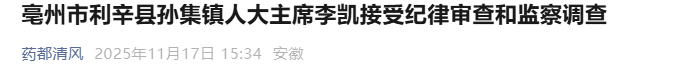 亳州市利辛县孙集镇人大主席李凯涉嫌严重违纪违法,目前正接受利辛县纪委监委纪律审查和监察调查。