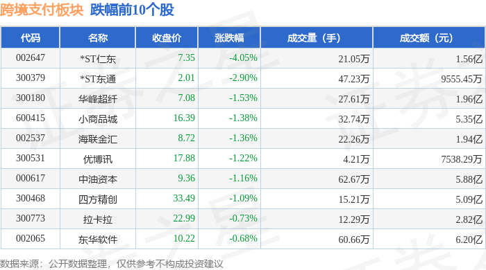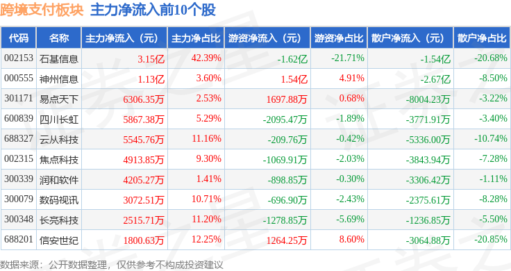 从资金流向上来看,当日跨境支付板块主力资金净流入3.24亿元,游资资金净流入9309.34万元,散户资金净流出4.17亿元。跨境支付板块个股资金流向见下表: