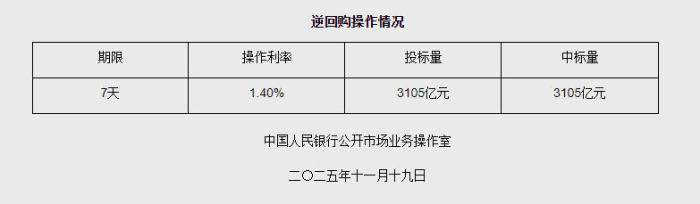 中新网11月19日电 据央行网站消息,2025年11月19日中国人民银行以固定利率、数量招标方式开展了3105亿元7天期逆回购操作。具体情况如下: