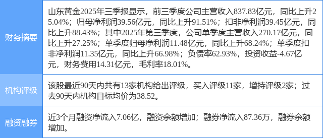 2025年10月31日,民生证券研究员邱祖学,王作燊发布了对山东黄金的研报《2025年三季报点评:低品位矿利用大幅提升,Q3利润不及预期》,该研报对山东黄金给出“买入”评级。研报中预计公司2025-2027年归母净利润分别为65.46/83.29/93.77亿元,按照10月31日收盘价,对应PE为25/20/18倍,维持“推荐”评级。证券之星数据中心根据近三年发布的研报数据计算,该研报作者对此股的盈利预测准确度为74.39%。