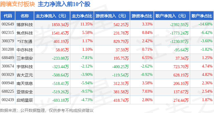 从资金流向上来看,当日跨境支付板块主力资金净流出20.58亿元,游资资金净流入4.32亿元,散户资金净流入16.26亿元。跨境支付板块个股资金流向见下表: