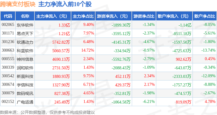 从资金流向上来看,当日跨境支付板块主力资金净流出2.46亿元,游资资金净流出2.37亿元,散户资金净流入4.83亿元。跨境支付板块个股资金流向见下表: