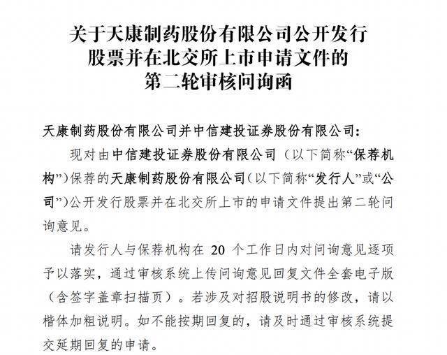 瑞财经 刘治颖 11月19日,天康制药股份有限公司(以下简称:天康制药)披露第二轮审核问询函,拟北交所上市,保荐机构为中信建投,保荐代表人为贾志华、蒲飞,会计师事务所为信永中和。