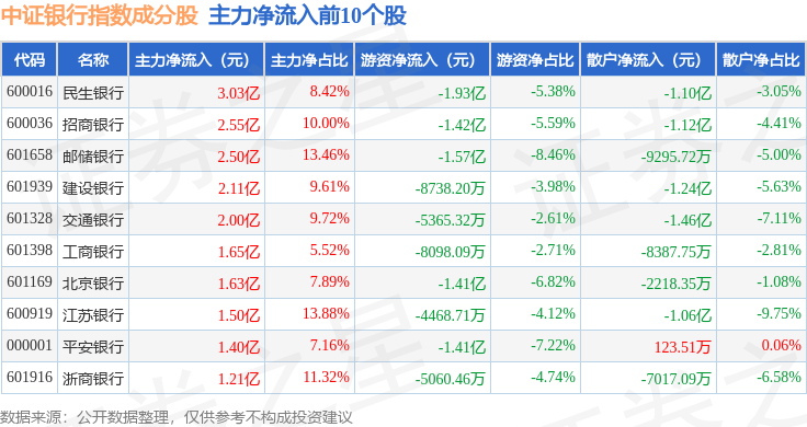 资金流向方面,中证银行(399986)指数成份股当日主力资金净流入合计21.61亿元,游资资金净流出合计12.47亿元,散户资金净流出合计9.13亿元。成份股资金流向详情见下表: