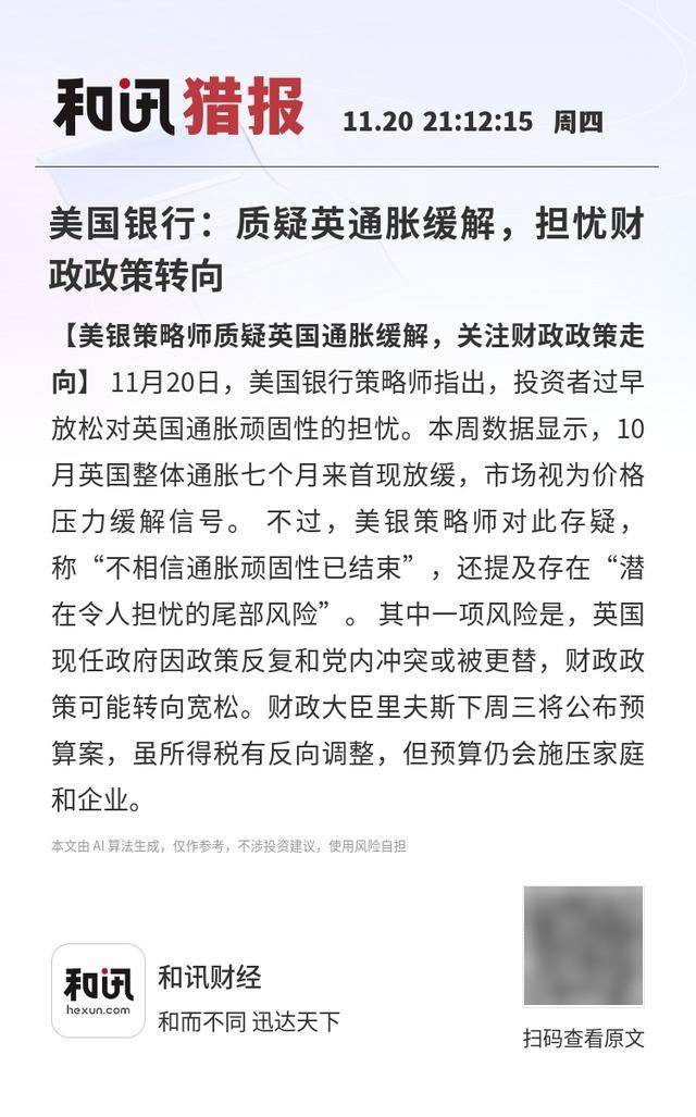 【美银策略师质疑英国通胀缓解,关注财政政策走向】11月20日,美国银行策略师指出,投资者过早放松对英国通胀顽固性的担忧。本周数据显示,10月英国整体通胀七个月来首现放缓,市场视为价格压力缓解信号。 不过,美银策略师对此存疑,称“不相信通胀顽固性已结束”,还提及存在“潜在令人担忧的尾部风险”。 其中一项风险是,英国现任政府因政策反复和党内冲突或被更替,财政政策可能转向宽松。财政大臣里夫斯下周三将公布预算案,虽所得税有反向调整,但预算仍会施压家庭和企业。