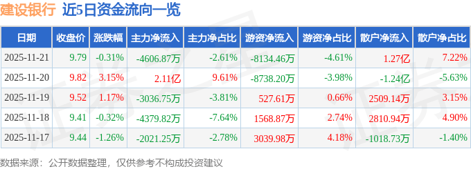 证券之星消息,截至2025年11月21日收盘,建设银行(601939)报收于9.79元,下跌0.31%,换手率1.88%,成交量180.01万手,成交额17.66亿元。
