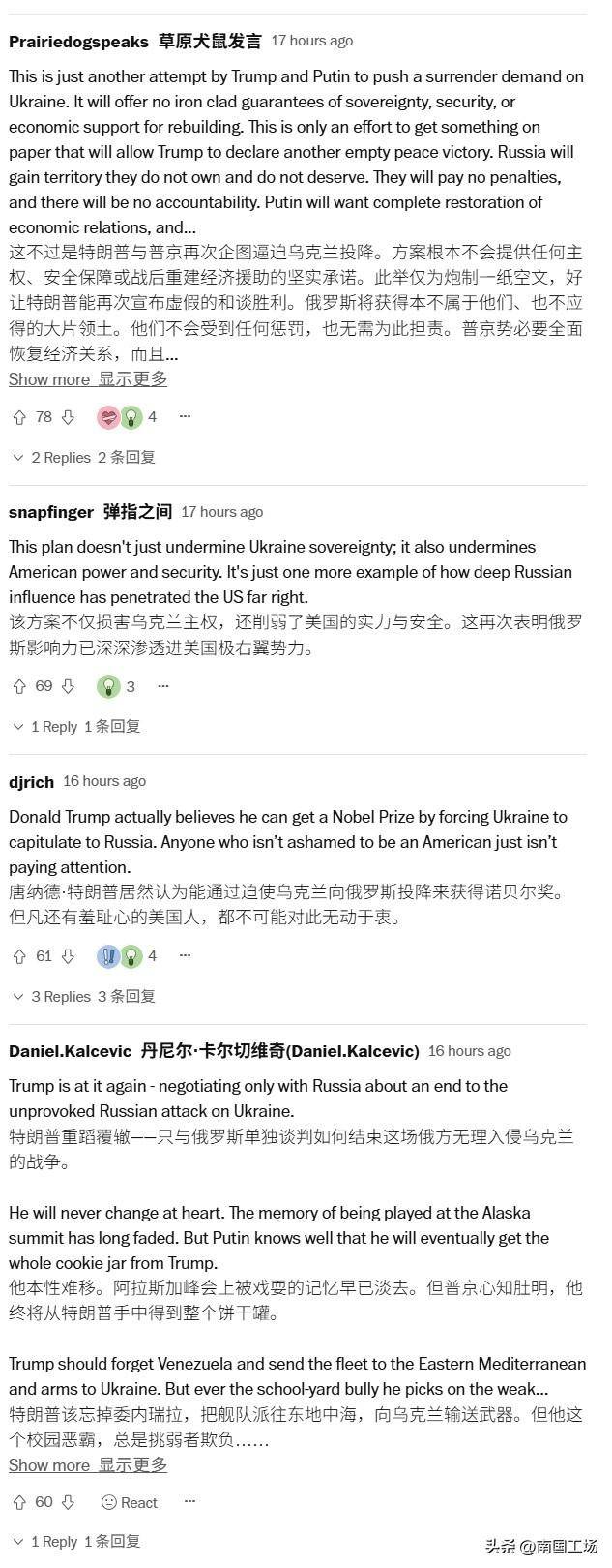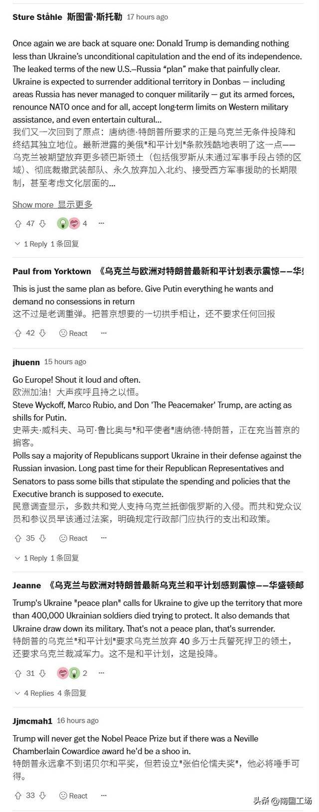 “我们又一次回到了原点:唐纳德·特朗普所要求的正是乌克兰无条件投降和终结其独立地位。最新泄露的美俄"和平计划”条款残酷地表明了这一点:乌克兰被期望放弃更多顿巴斯领土(包括俄罗斯军队从未通过军事手段占领的区域)、彻底裁撤武装部队、永久放弃加入北约、接受西方军事援助的长期限制,甚至考虑文化层面的”,“这不过是老调重弹。把普京想要的一切拱手相让,还不要求任何回报”,“特朗普的乌克兰"和平计划”要求乌克兰放弃40多万士兵誓死捍卫的领土,还要求乌克兰裁减军力。这不是和平计划,这是投降”,“特朗普永远拿不到诺贝尔和平奖,但若设立“张伯伦懦夫奖”,他必将唾手可得。”