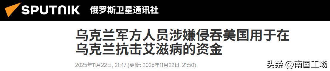 同时,俄罗斯卫星网在11月22日夜报道,乌克兰军方官员和一名非政府组织负责人,涉嫌侵吞美国拨给乌克兰用于抗击艾滋病的资金。国际公共组织与乌克兰武装部队医疗部队指挥部合谋,包括一名乌克兰武装部队军医上校,侵吞由美国“总统艾滋病紧急救援计划”的资金。乌克兰不法分子至少窃取了675万格里夫纳(约合16万美元)的医疗资金,而这些钱,被乌克兰军方挪用。而按照美国的数据显示,美国拨给乌克兰用于抗击艾滋病的资金,总额超过6600万美元。