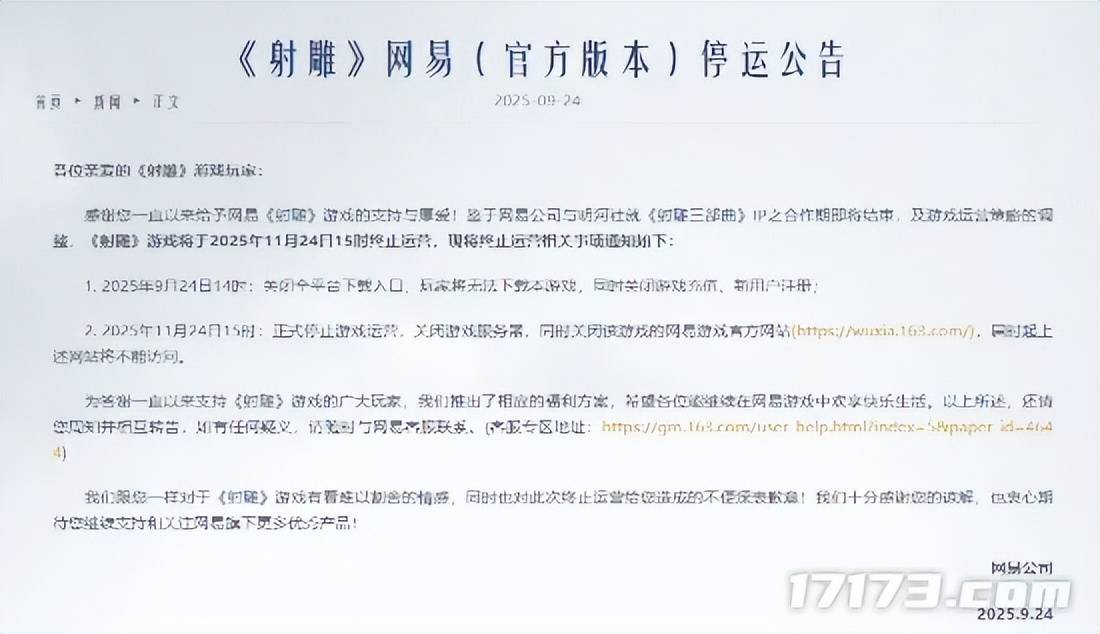 划重点:网易《射雕》正式停止运营 曾宣传150年长线运营