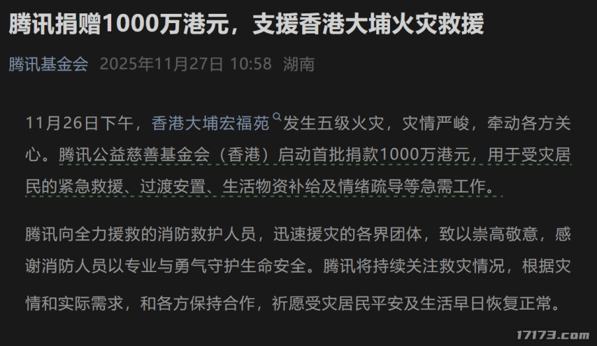 目前、阿里巴巴、腾讯、小米、字节、网易等多个厂商均向中国香港捐赠款项驰援火灾。