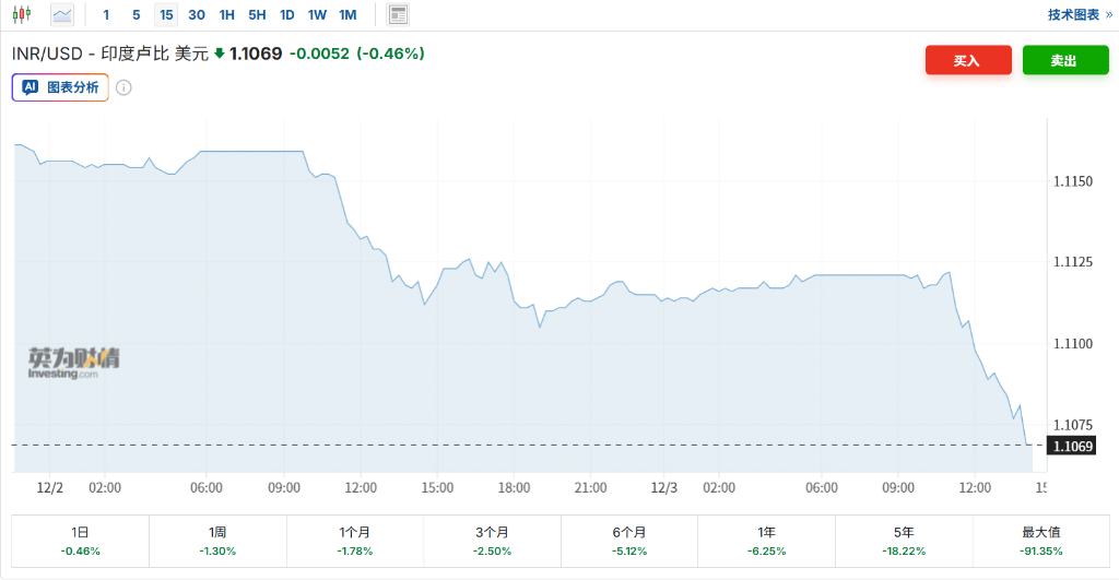 12月3日周三,印度卢比兑美元汇率一度贬值0.3%,触及90.1575的历史新低。据分析,印度与美国贸易谈判停滞不前打击了市场情绪。