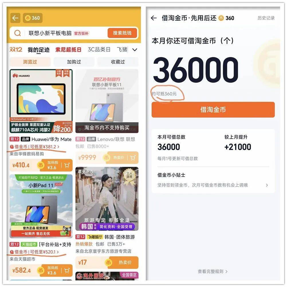 再来说“借淘金币”,这是9月28日上线试运行的一项功能,在产品标题下方会有一个“借金币”的文字提示,点一下就可以跳转至专门的界面。也可以从某宝首页搜“淘金币”进入专门页面,从“淘金币余额”里面找到借金币入口。
