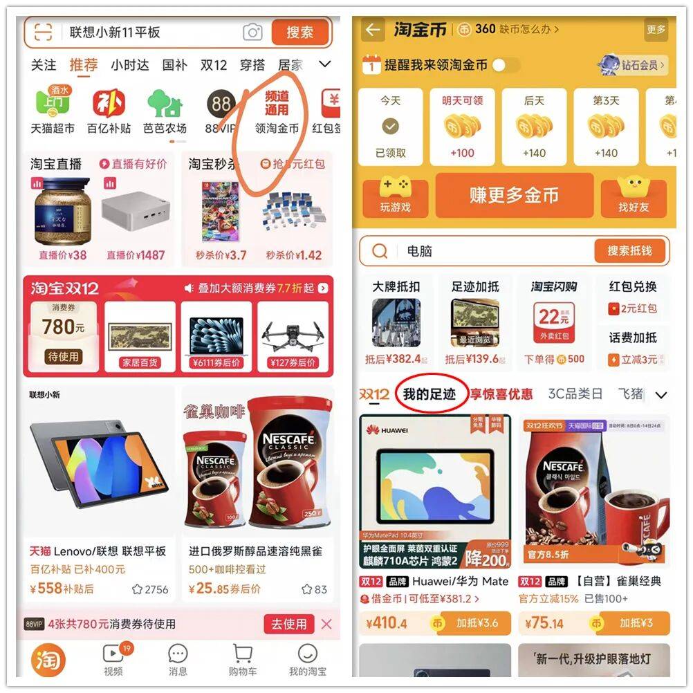 再来说说淘金币的使用路径,平时如果发现一款产品价格特别低后,只要日常浏览过,就可以从某宝首页“领淘金币”板块进去,然后手动点击“我的足迹”,就可以看到最近浏览过的商品,标题下面就是淘金币可以抵扣的金额,从这里下单就能抵扣淘金币。