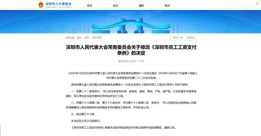 《深圳市人民代表大会常务委员会关于修改〈深圳市员工工资支付条例〉的决定》经深圳市第七届人民代表大会常务委员会第四十一次会议于2025 年 10 月 30 日通过,广东省第十四届人民代表大会常务委员会第二十二次会议于 2025 年 12 月 4 日批准,现予公布,自公布之日起施行。