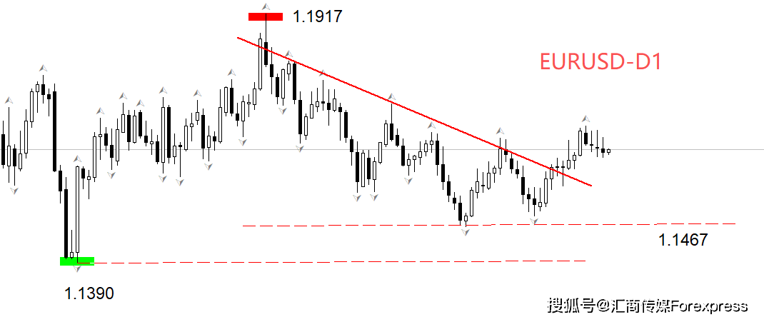 行情方面,EURUSD日线级别,呈现出上涨末期的高位震荡特征。1.1390是中期低点,1.1917是中期高点,目前行情正在寻找最新的中期低点。11月5日的低点1.1467最有可能成为中期低点,因为其右侧存在次低点1.1490点。最新上涨波段已经突破红色下降趋势线,中短期走势偏多。最新分型结构为顶分型,短期走势存在回调可能。