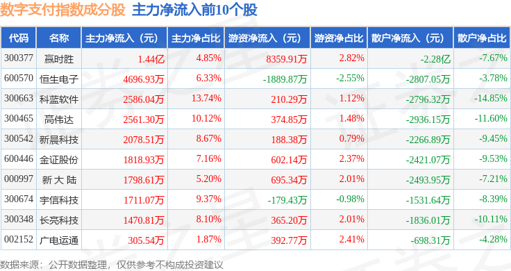 资金流向方面,数字支付(980113)指数成份股当日主力资金净流出合计4.68亿元,游资资金净流入合计2.39亿元,散户资金净流入合计2.29亿元。成份股资金流向详情见下表: