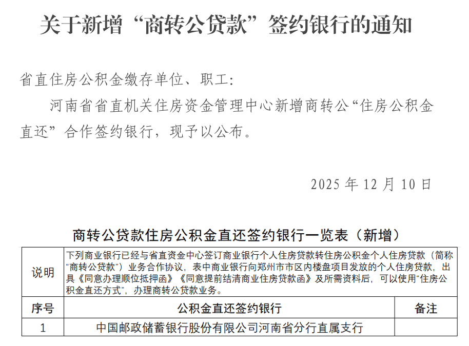 【大河财立方消息】12月11日消息,河南省省直机关住房资金管理中心新增商转公“住房公积金直还”合作签约银行——中国邮政储蓄银行股份有限公司河南省分行直属支行。