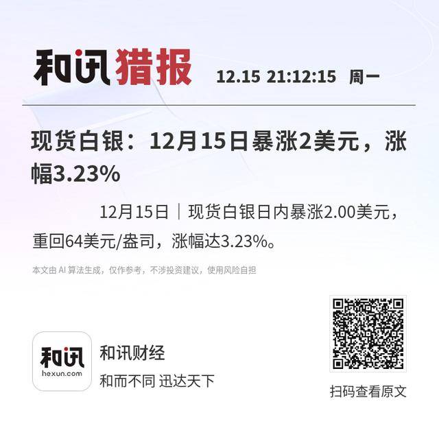 12月15日|现货白银日内暴涨2.00美元,重回64美元/盎司,涨幅达3.23%。