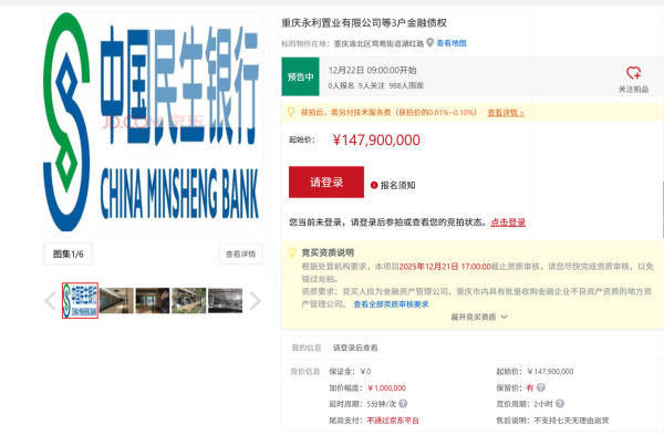 近日,中国民生银行重庆分行在京东资产交易平台挂牌转让一笔“恒大系”的债权,涉及重庆永利置业有限公司等3户金融债权。相较9.92亿元的债权合计金额,这笔债权的起拍价约为1.48亿元,接近“1.5折”。