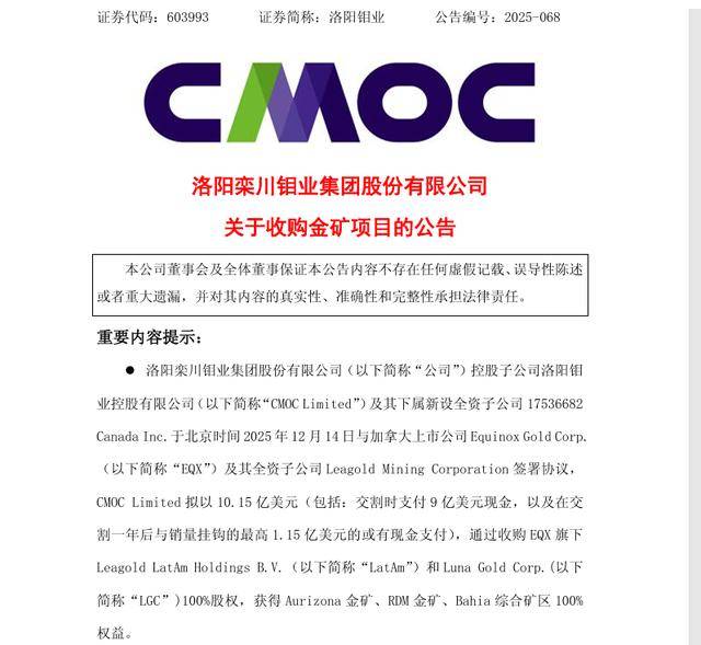 据公告,洛阳栾川钼业集团股份有限公司控股子公司洛阳钼业控股有限公司及其下属新设全资子公司17536682Canada Inc.于北京时间2025年12月14日与加拿大上市公司EquinoxGoldCorp.及其全资子公司Leagold MiningCorporation签署协议,通过收购EQX旗下Leagold LatAmHoldings B.V和Luna Gold Corp.的100%股权,获得上述三个金矿资产。