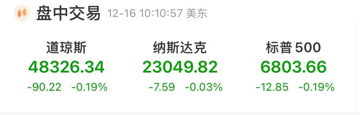 12月16日,美股三大指数集体低开,截至发稿,道琼斯指数跌0.19%,标普500指数跌0.19%,纳斯达克综合指数跌0.03%。