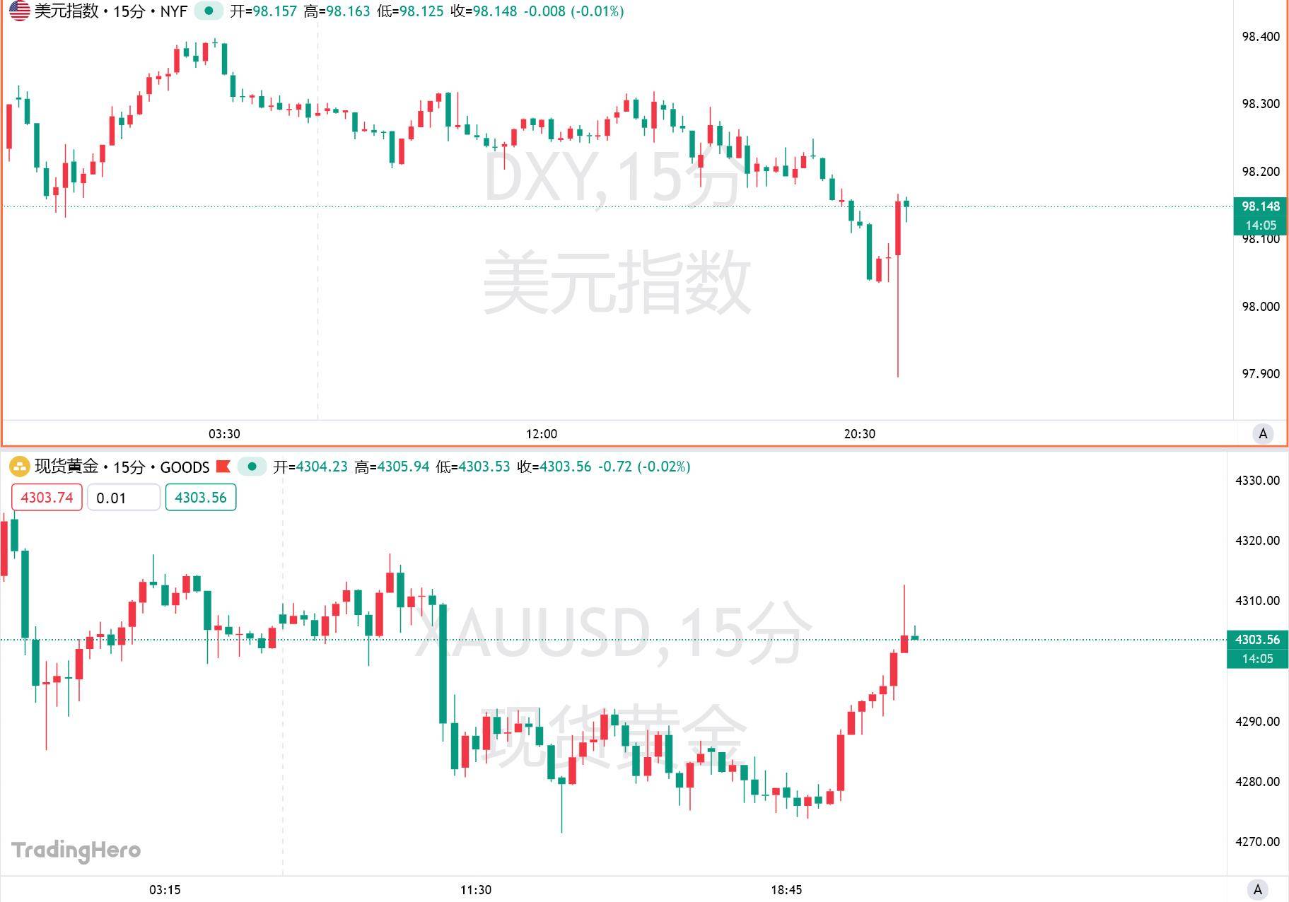 美元指数闻讯跌破98,为10月6日以来首次,随后迅速反弹。现货黄金短线上扬,一度回升至4310美元/盎司上方。非美货币对走高,欧元兑美元上扬10余点;英镑兑美元上扬近20点;美元兑日元下挫30点。