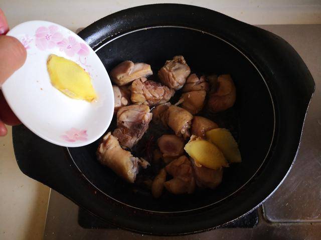 制作过程: 1. 烧热锅放入少许油,将准备好的鸡腿肉放进锅中翻炒,炒干水分后加入少许姜片继续翻炒几下,再烹饪少许料酒翻炒均匀;