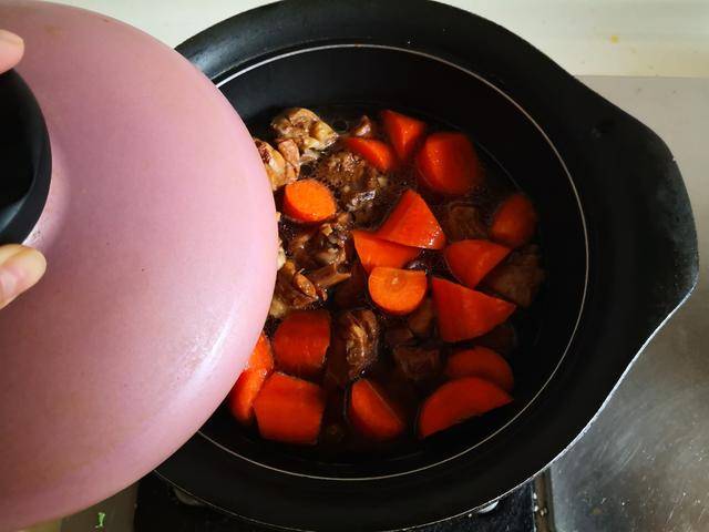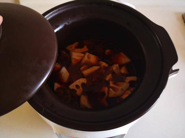 3. 将炒好的牛肉块放进电炖锅种, 加入适量的水炖煮,加盖后按下电炖锅上炖煮牛羊肉的功能键;