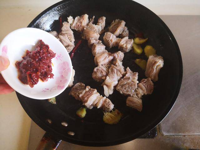 2. 烧热锅放入适量的油, 将焯好的牛肉块放进锅中翻炒几下, 加入少许姜片和干辣椒放进锅中翻炒, 再将郫县豆瓣酱煸炒出红油,加入少许料酒和生抽翻炒均匀;