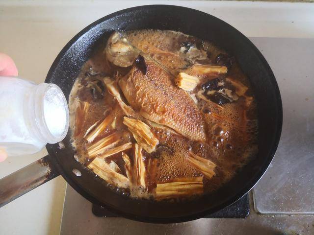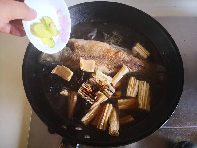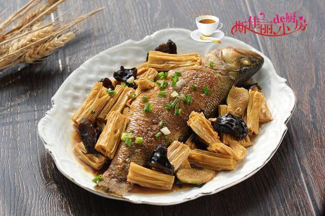 推荐菜谱【木耳腐竹烧鲈鱼】 原料:鲈鱼 1条 腐竹 1小把 黑木耳 1小把 料酒 1勺 生抽 1勺 油盐 少许