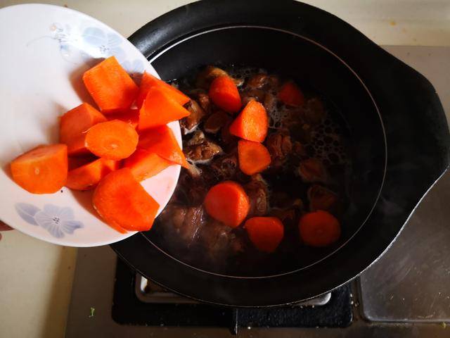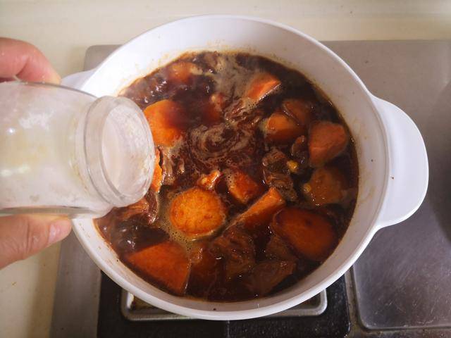 4. 将炖煮好后的牛腩汤盛入钵中加热, 再将准备好的红薯块放进锅中去煮上五分钟,将红薯煮熟后加入少许盐和胡椒粉调味, 最后大火收汁放入少许葱花即可。