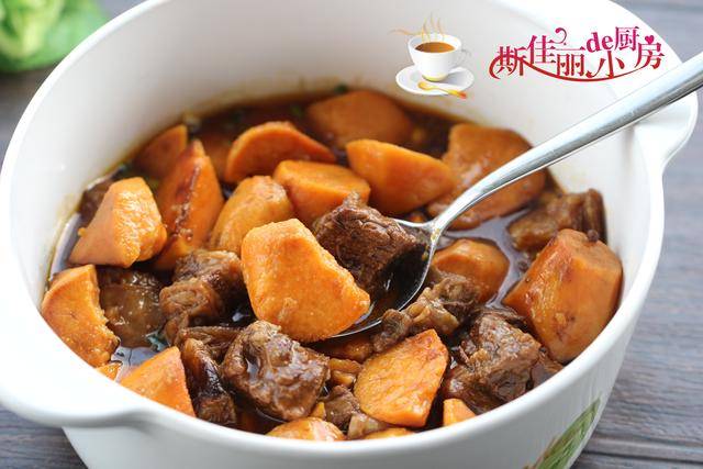 第二道菜: 红薯炖牛腩,牛肉高蛋白、低脂肪,是冬季滋补佳品之一,既能补充营养,提升免疫力,还能驱寒暖胃,让孩子健康成长不长胖。 将它搭配上冬季的红薯一起炖煮,牛肉鲜香软烂,红薯鲜甜味美,是菜也是主食, 食材家常又健康,既能补营养又能抗寒,妥妥的冬季滋补菜,孩子爱吃抵抗力强,还长得高,不怕冷。