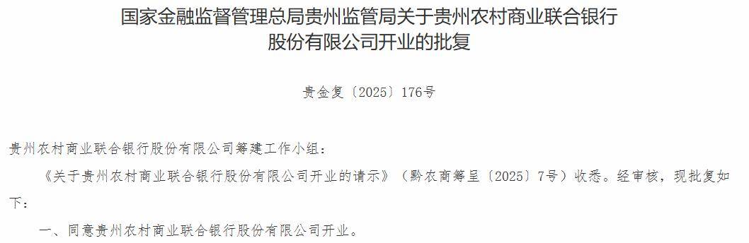 根据批复,贵州农商联合银行应当在领取营业执照之日起6个月内正式开业。