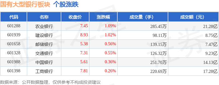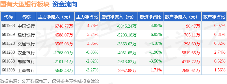 从资金流向上来看,当日国有大型银行板块主力资金净流入5383.48万元,游资资金净流出1.97亿元,散户资金净流入1.43亿元。国有大型银行板块个股资金流向见下表: