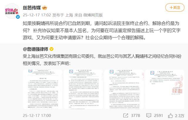 12月17日,丝芭传媒再次发文质疑鞠婧祎,称其解约行为自相矛盾,玩文字游戏。