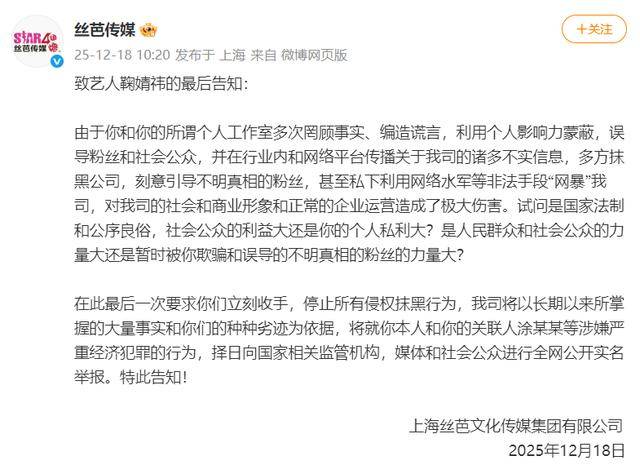 12月18日,据白鹿视频报道,丝芭传媒发文“致艺人鞠婧祎的最后告知”。