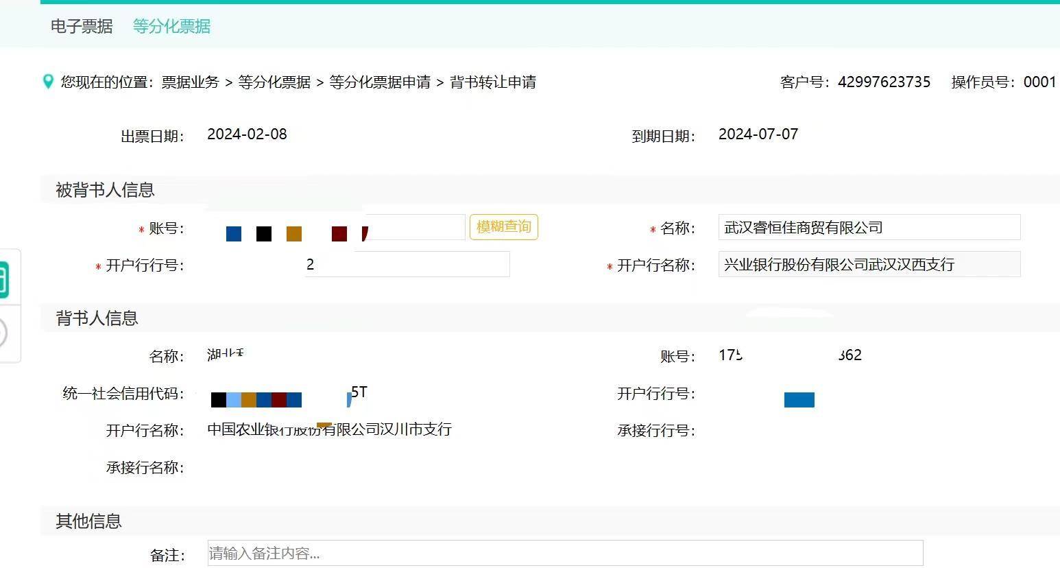接下来点击 票据业务 - 等分化票据 - 等分化票据申请 - 背书转让申请,选择需要背书转让的新一代票据,在背书转让金额对话框中,输入票据(包)金额以内的任意金额(假如票据包金额为100万,背书时可以在方框中输入10万、15万、30万等,根据实际使用情况输入任意金额)然后填写被背书人账号、名称、开户行行号和开户行名称,再点“提交”完成。