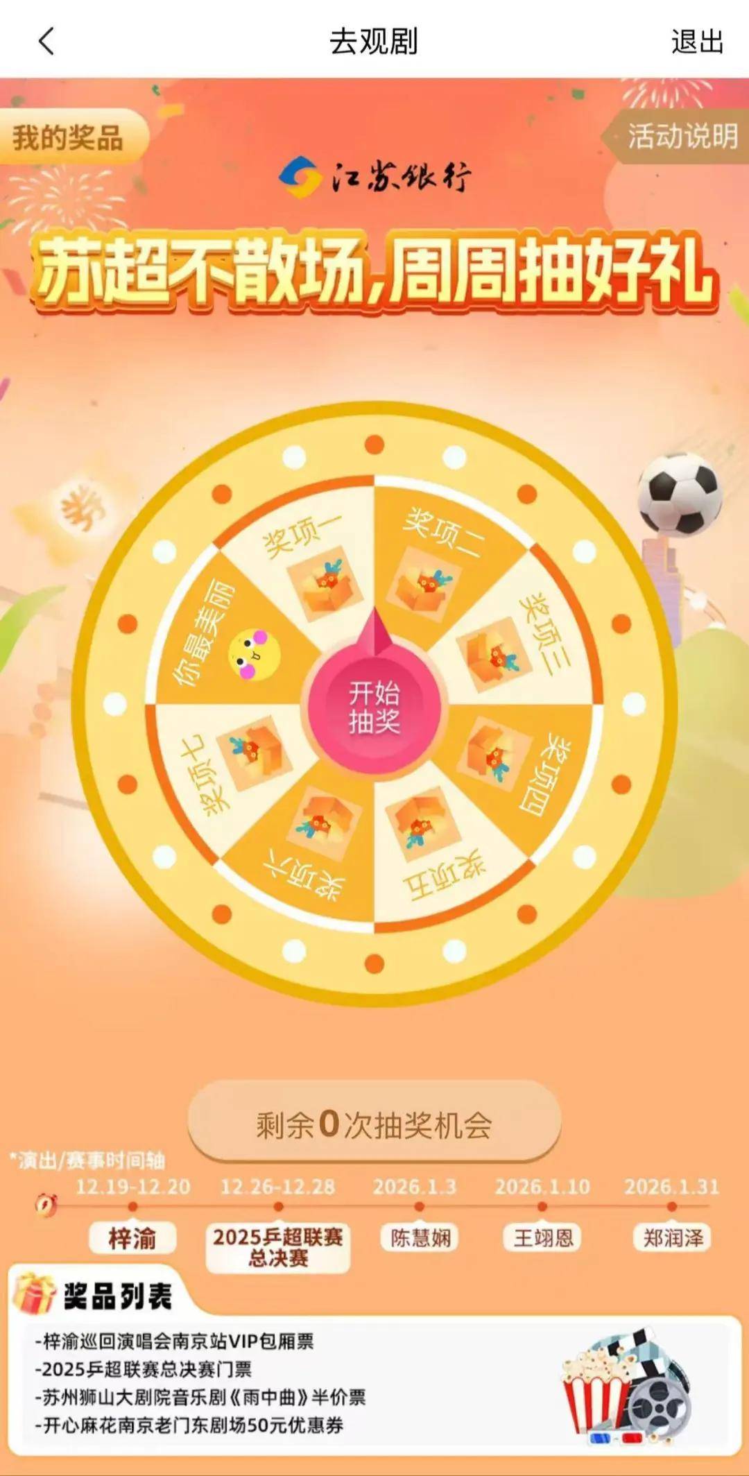 笔者仅举一个例子。2025乒超总决赛、歌手兼短剧明星梓渝的演唱会信息,只是12月15日开启的活动,而在活动区,江苏银行App用一个时间轴,把南京两个月内的体育演艺信息都给你列出来了!