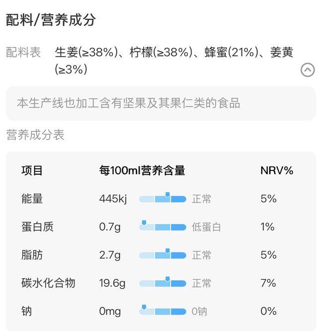 据山姆配料表,旗下的姜黄饮品每100ml含有32g的糖。维乐鲜、有乐岛等品牌的姜黄饮也大都加入了蜂蜜、菠萝汁、橙汁等成分,每瓶饮料中的糖分含量均超过10g。