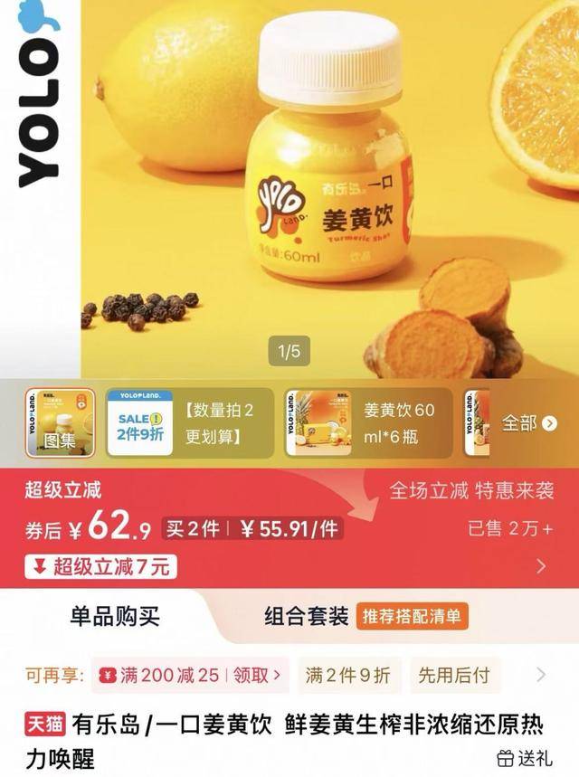 食品品牌有乐岛的“一口姜黄饮”,6瓶共计360ml,叠加折扣售价62.9元。其天猫旗舰店显示该产品已售出1万+件,是店内浓缩果蔬汁热销第一名。