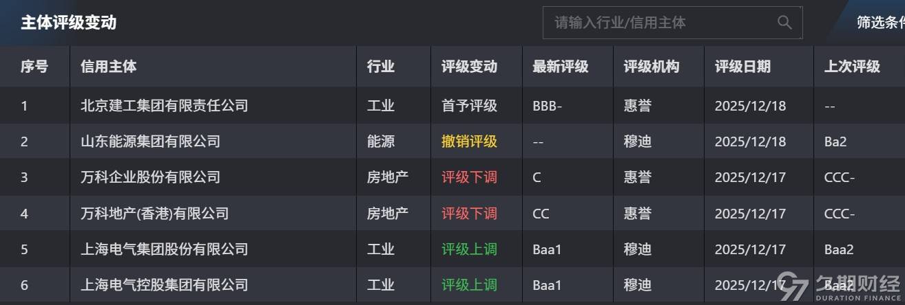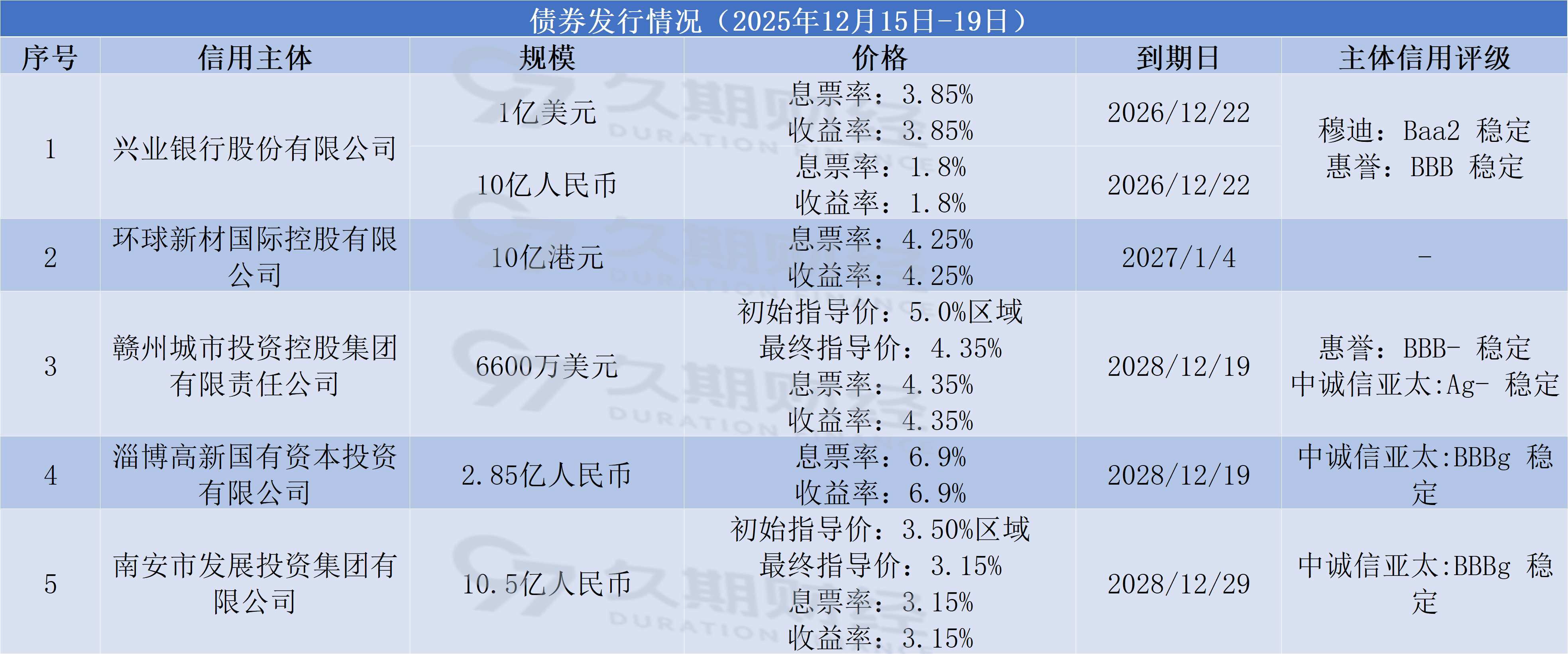 公司公告及新闻方面,万科企业“22万科MTN005”公布展期议案,提议将本金兑付展期12个月及延长宽限日至30天并提供增信;“22万科MTN004”第二次持有人会议将审议拟宽限期内支付6000万元利息并提供增信等议案;金科股份(000656.SZ)发布公告,公司及重庆金科重整计划均已执行完毕;华南城(01668.HK)公布债务重组时间表,须于2027年2月10日前复牌保上市地位;融创中国(01918.HK)预计境外债重组将于12月23日前后落实,约96亿美元境外债将获全面解除及免除;佳兆业集团(01638.HK)延长有关票据同意征求届满期限至12月28日;中国奥园(03883.HK)延长境外债务重组计划持有期至2026年3月23日;路劲(01098.HK)子公司递延支付ROADKG 7 PERP分配款项。