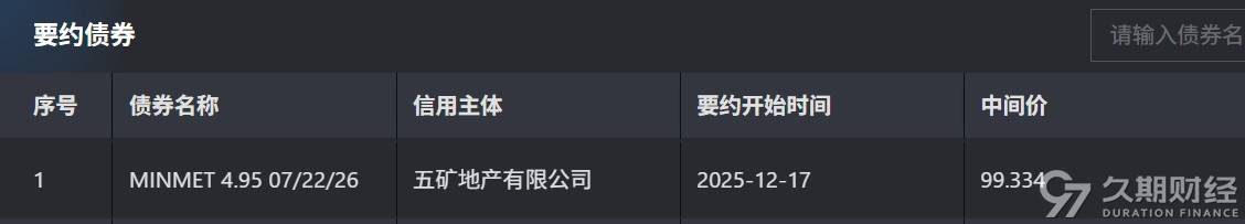 五矿地产子公司发布公告,对MINMET 4.95 07/22/26发起回购要约及征求同意,拟修改条款以增设提前赎回权。购买价格为以1,000美元回购每1,000美元本金,要约将于2026年1月5日届满。