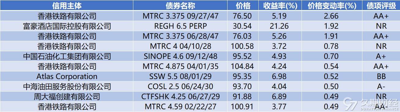 产业板块方面,阿里巴巴BABA 3.4 12/06/27和BABA 4.2 12/06/47(1052.5万美元和780万美元),永利澳门WYNMAC 5.125 12/15/29(702万美元),小米集团XIAOMI 4.1 07/14/51(698.7万美元),金沙中国SANLTD 2.3 03/08/27(600.6),美团MEITUA 4.75 11/05/32(600万美元);