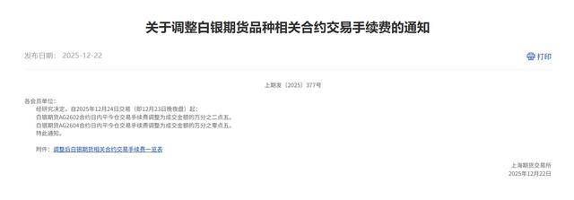 此外,经研究决定,自2025年12月24日交易(即12月23日晚夜盘)起:白银期货AG2602合约日内平今仓交易手续费调整为成交金额的万分之二点五。白银期货AG2604合约日内平今仓交易手续费调整为成交金额的万分之零点五。