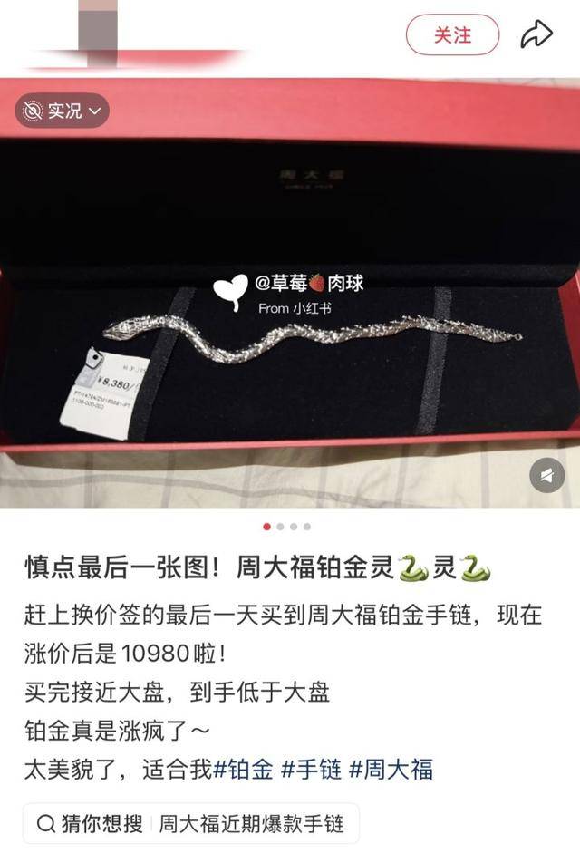 前几天,一位网友赶在涨价前花8380元买了一条14克左右的周大福铂金灵蛇手链,这两天的标签价已经上调到了10980元/克,几天时间标价上调2600元。