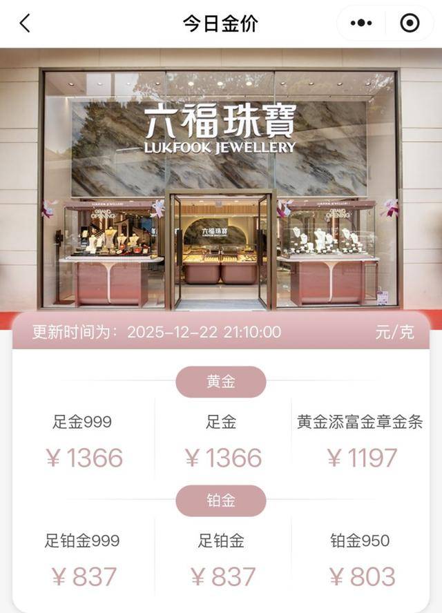 根据每天更新的价格,12月22日,六福珠宝足铂金为837元/克,而12月11日和12月15日的价格分别是700元/克和731元/克。短短11天时间,每克上涨137元。
