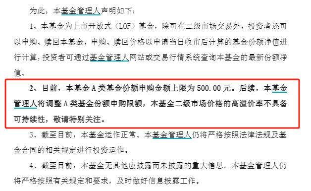 基金公司23日发布溢价风险提示公告称,目前A类基金份额申购金额上限为500元。后续,基金管理人将调整A类基金份额申购限额,并表示,该基金二级市场价格的高溢价率不具备可持续性。